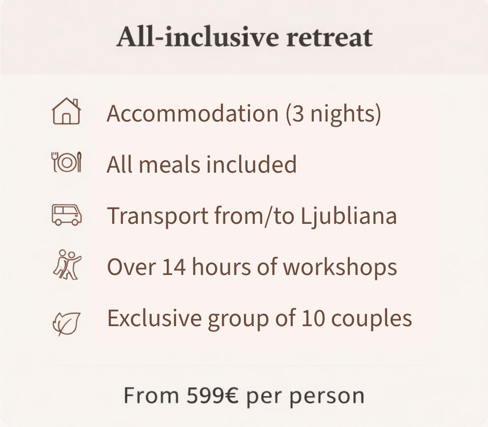 This is an exclusive retreat for just 10 COUPLES, offering a rare opportunity to step out of everyday rhythm and into a few days of calm, presence, and shared experience. Surrounded by nature in Slovenia, we gather with a simple intention: to RECONNECT β with ourselves, with each other, and with a deeper sense of presence in our dance.We will focus on: