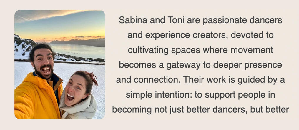 This retreat marks the first time Brenda and William come together in an immersive retreat format, creating a rare opportunity to experience their shared vision beyond workshops and events.They blend their signature approach to connection, grounding, and organic movement with space for integration, curiosity, and real transformation. Itβs an intimate invitation to step inside their process, to feel how technique, presence, and embodiment weave together, and to experience their knowledge not just as something you learn, but something you truly live, together, over time.